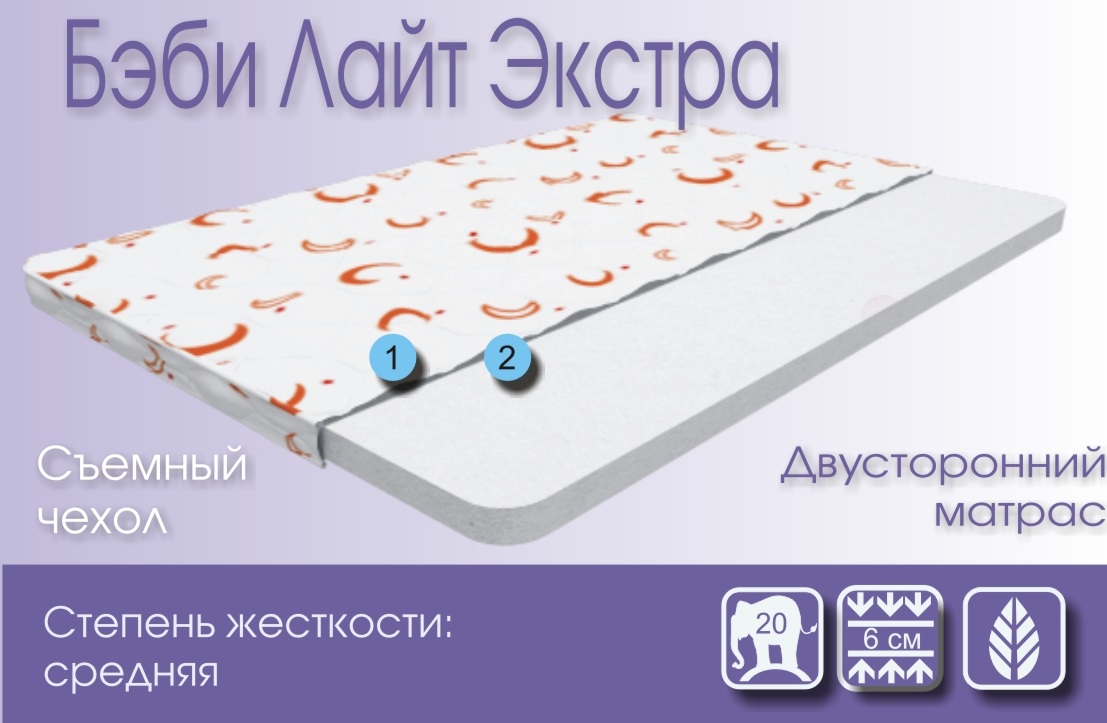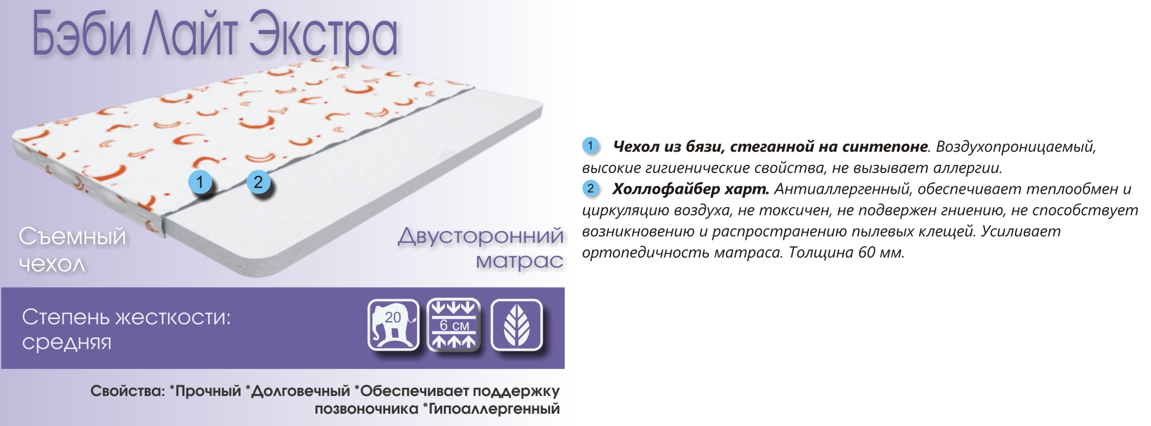 Бэби Лайт Эстра - средняя жесткость. Прочный, долговечный, обеспечивает поддержку позвоночника, гипоаллергенный.