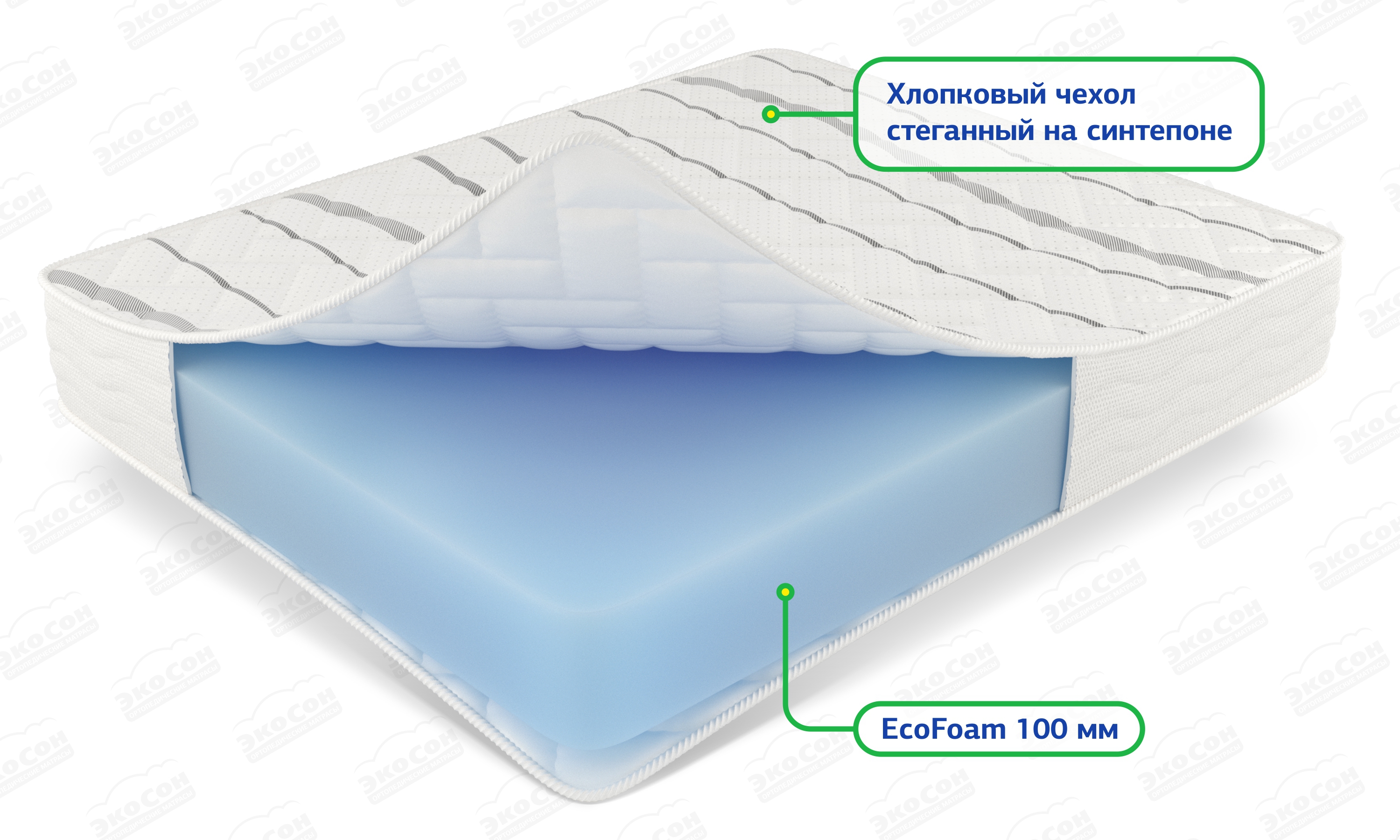 EcoFoam изготавливается из высокотехнологичной пены и имеет микропоры в структуре. За счет этого материал хорошо проветривается, в нем не застаиваются посторонние запахи, влага. Обладает анатомическими свойствами, принимает форму тела спящего во время сна.