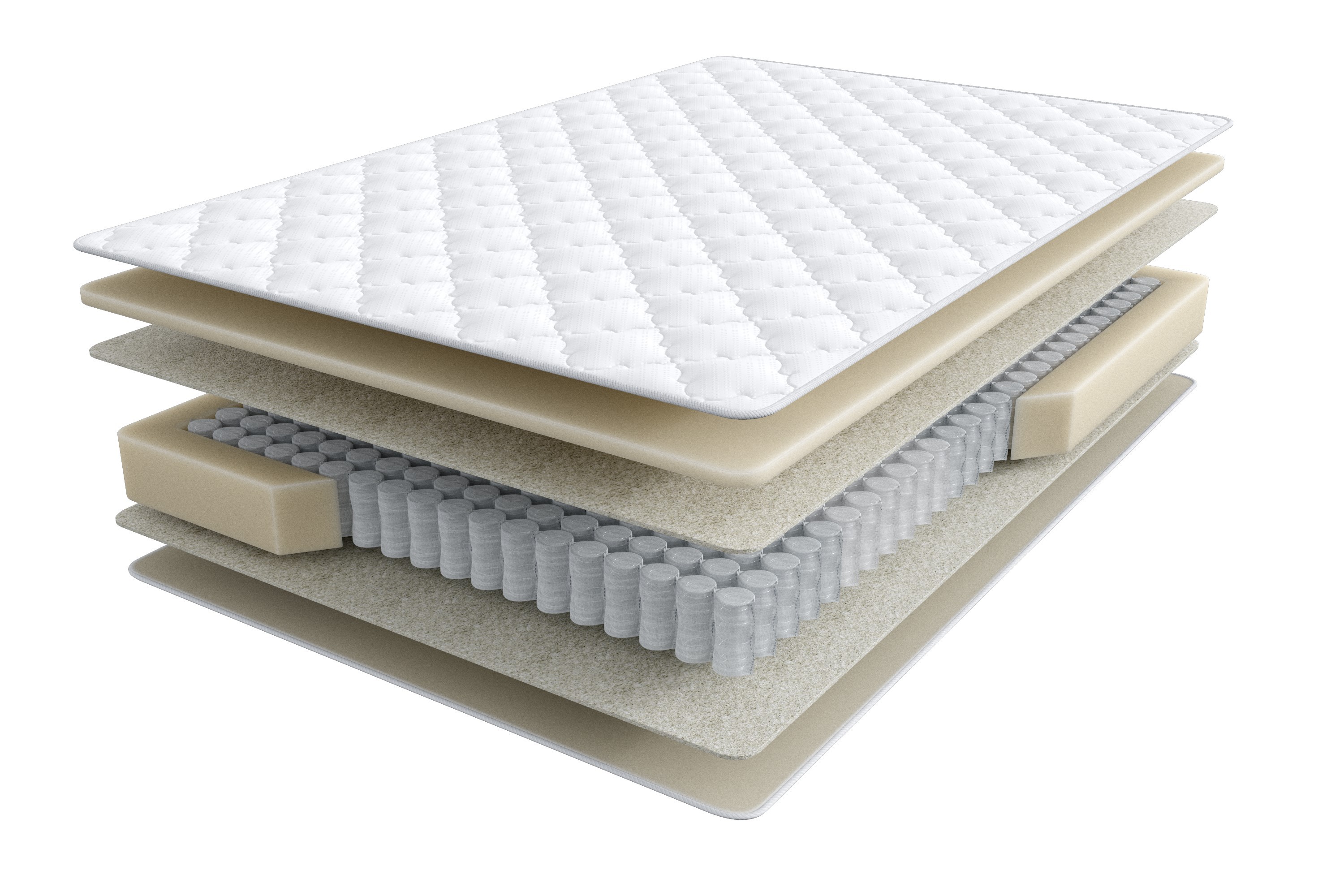 Белый войлок - изготавливается из очищенного хлопкового сырья. Применяется с целью защиты наполнителей от повреждений. Плотный и упругий материал — отличный изолятор (отделяет пружинный блок от верхних настилов). Его использование обеспечивает более равномерное распределение давления пружин на тело спящего, увеличивает комфорт и продлевает срок эксплуатации матраса.