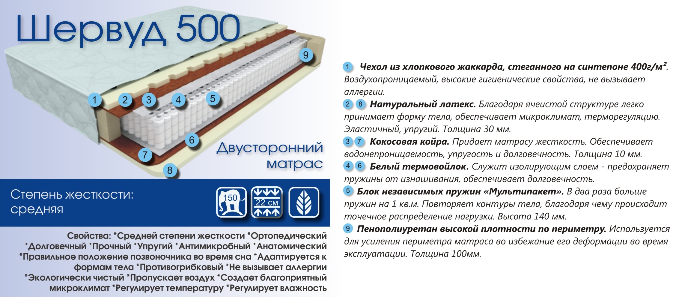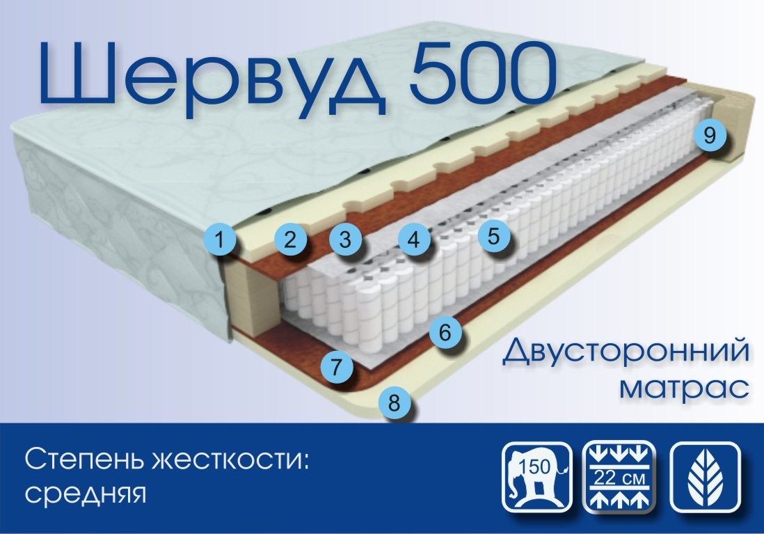 Шервуд 500 - комбинированный матрас средней жесткости Шервуд 500 изготовлен на основе пружинного блока "Мультипакет". Уникальный пружинный блок "Мультипакет" идеально адаптируется к формам Вашего тела, а его сочетание с натуральными материалами дарит Вам максимальное расслабление, а вместе с тем - здоровый отдых.