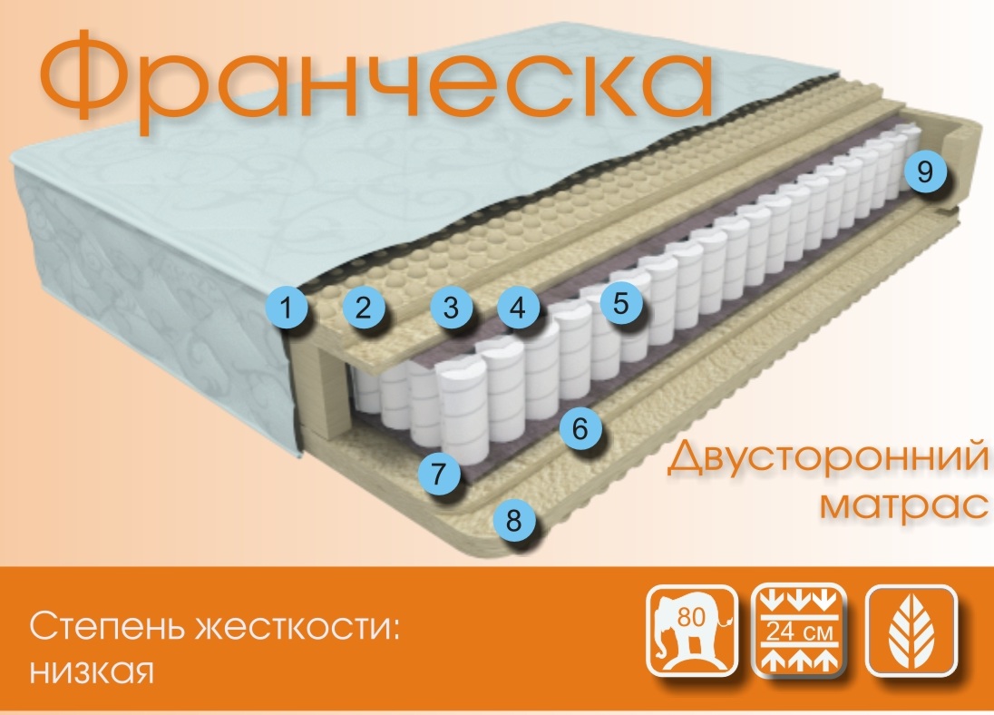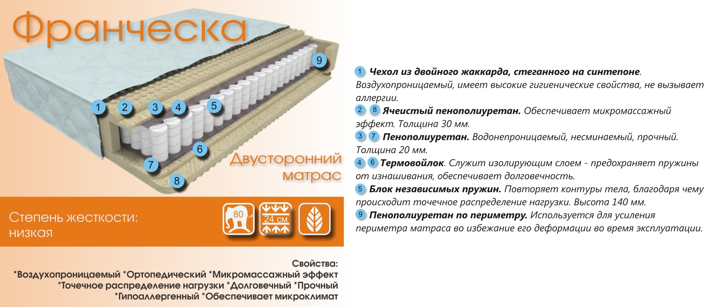 Франческа - мягкий матрас. Воздухопроницаемый, ортопедический, микромассажный эффект, точечное распределение нагрузки, долговечный, прочный, гипоаллергенный обеспечивает микроклимат.