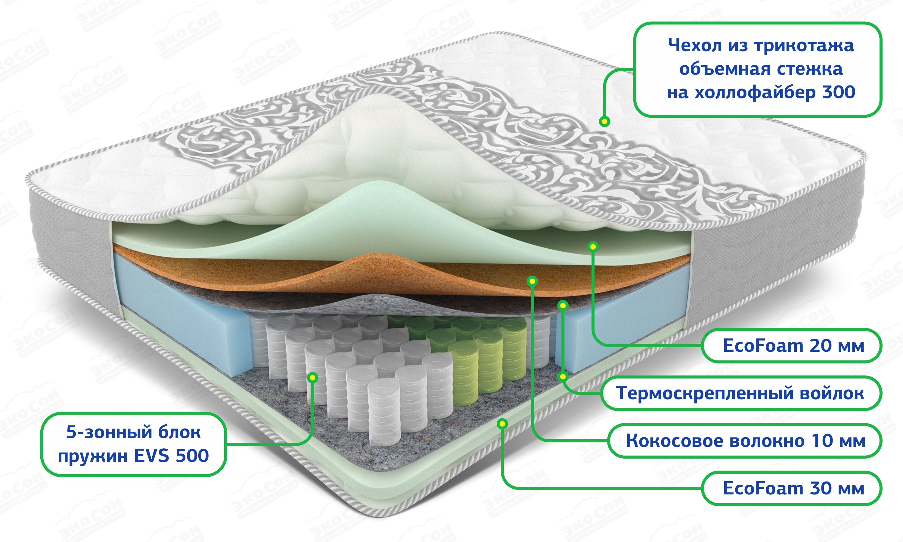 • Слой EcoFoam 30 мм и термоскрепленного войлока с одной стороны создают комфортность и упругость