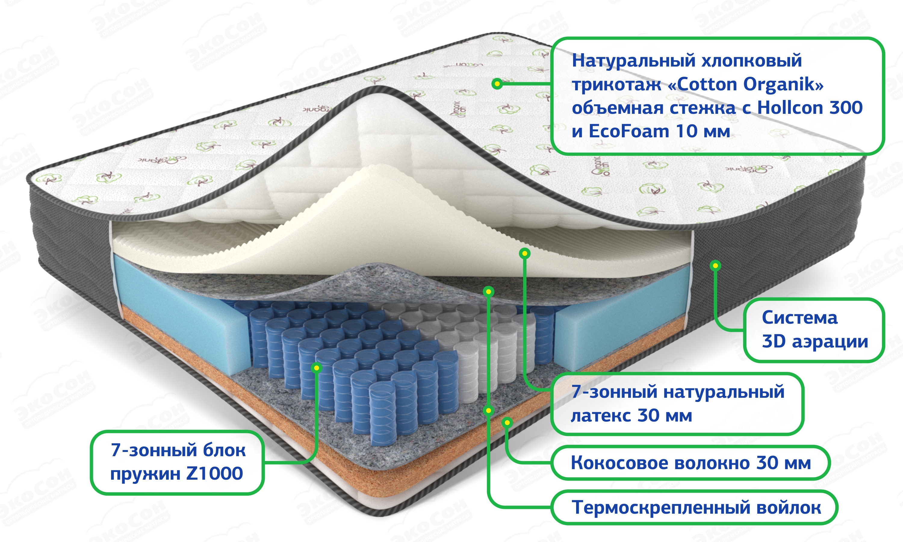 Чехол из хлопкового трикотажа "Cotton Organik" стеганный на Hollcon (300) и Ecofoam (10 мм), высокообъемный борт по периметру 3D Aerosistem