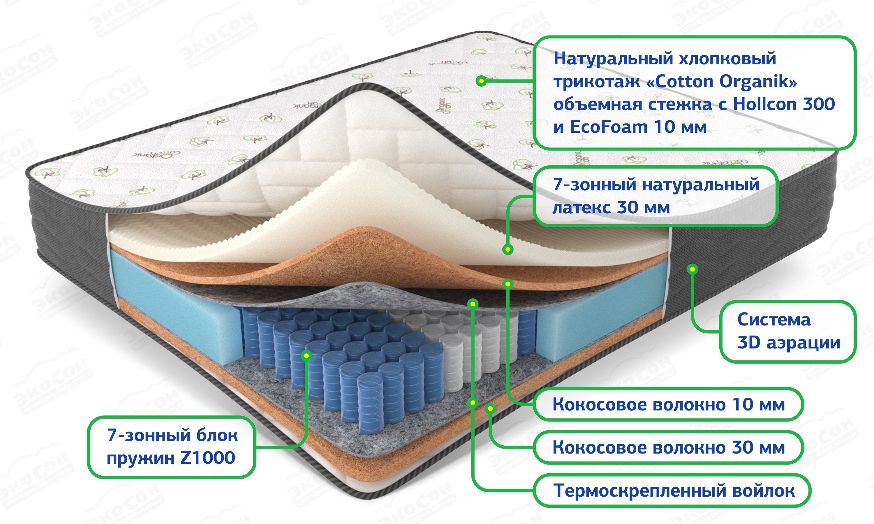 Чехол из хлопкового трикотажа "Cotton Organik" стеганный на Hollcon (300) и Ecofoam (10 мм), высокообъемный борт по периметру 3D Aerosistem