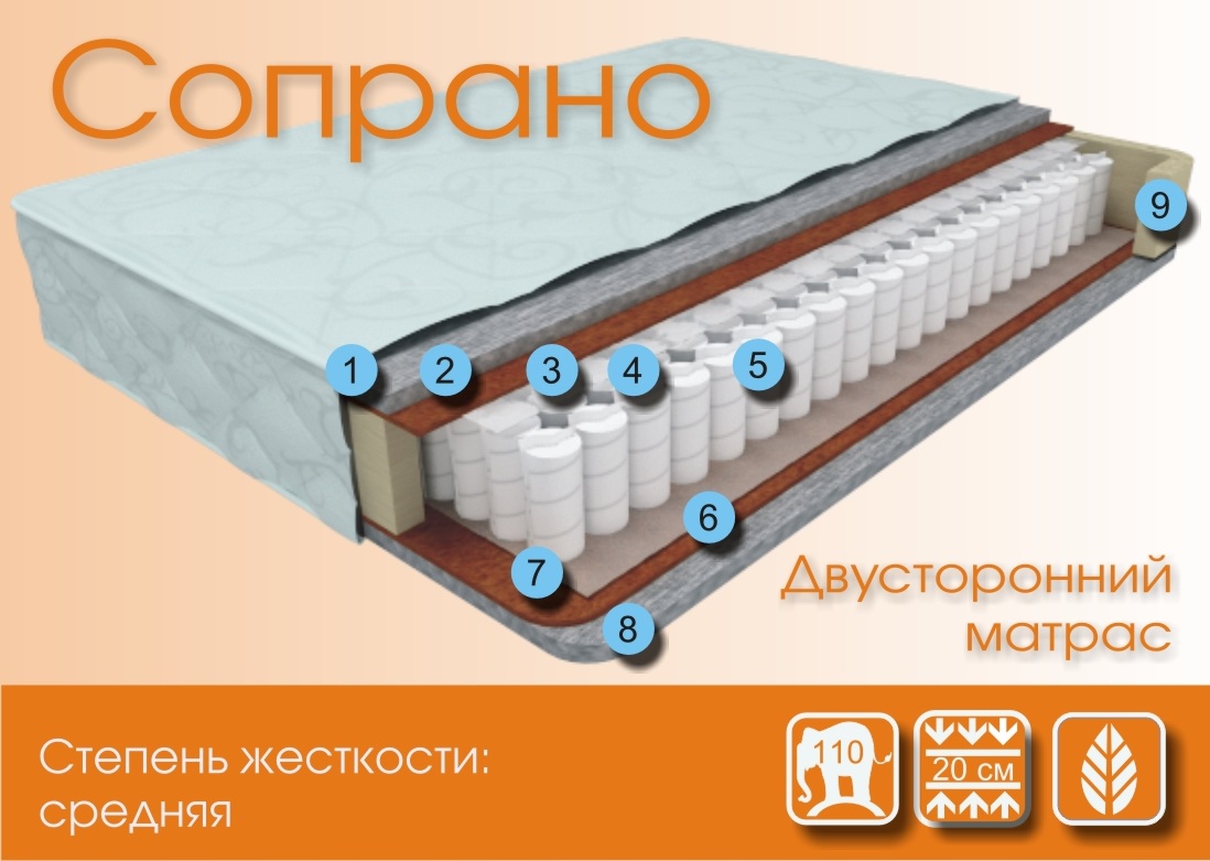 Сопрано -жесткость средняя. Ортопедический, Анатомический , Точечное распределение нагрузки, Повторяет контуры тела, Долговечный, Прочный,Гипоаллергенный, Антигрибковый, Антимикробный, Обеспечивает микроклимат, Экологичный.Сочетание струттофайбера и кокосовой койры делают этот матрас действительно удобным и комфортным. Подходит для людей чей вес не превышает 110кг. Хороший вариант для супружеских пар, у которых разница в весе не превышает 50кг.