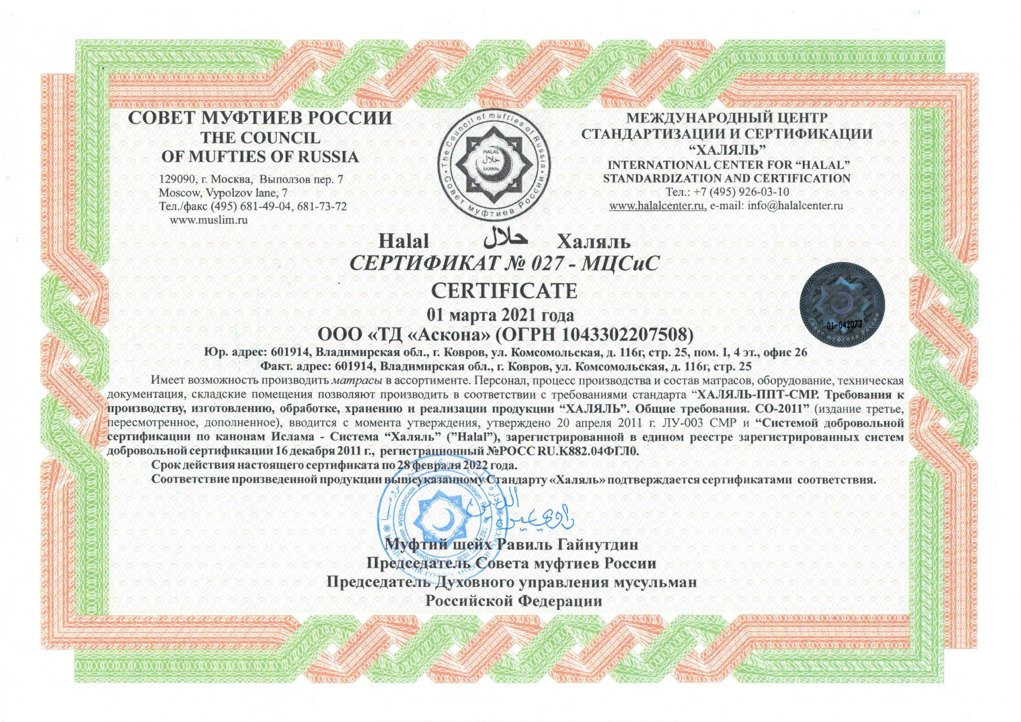 Впервые в России запускаются матрасы, имеющие сертификат HALAL (Халяль) - документальное удостоверение соответствия продукции, требованиям стандартов "Халяль" Совета муфтиев России.